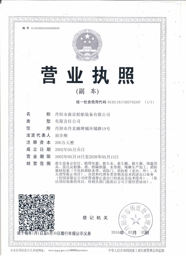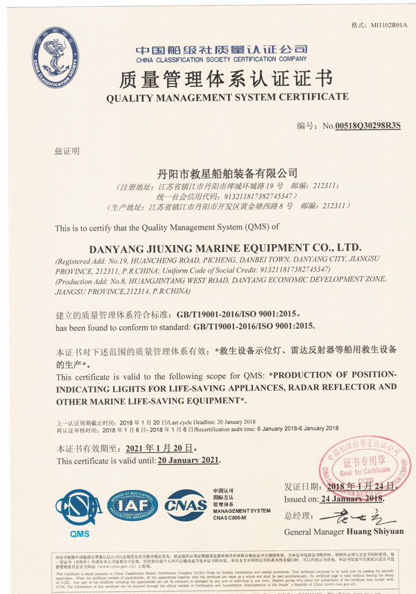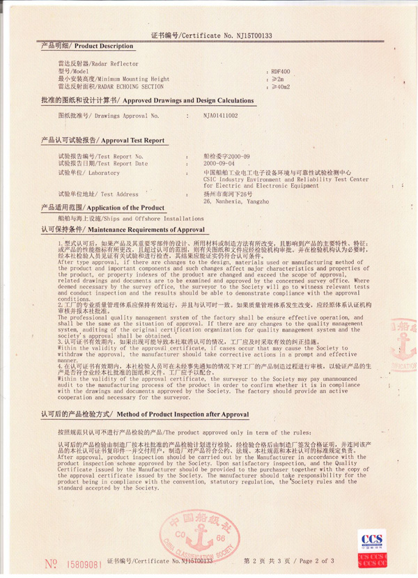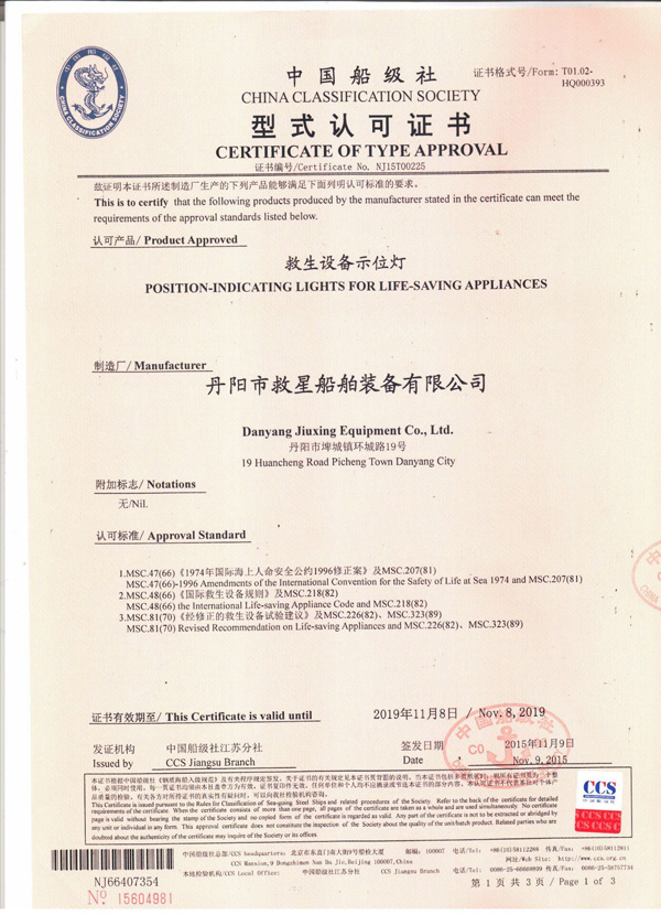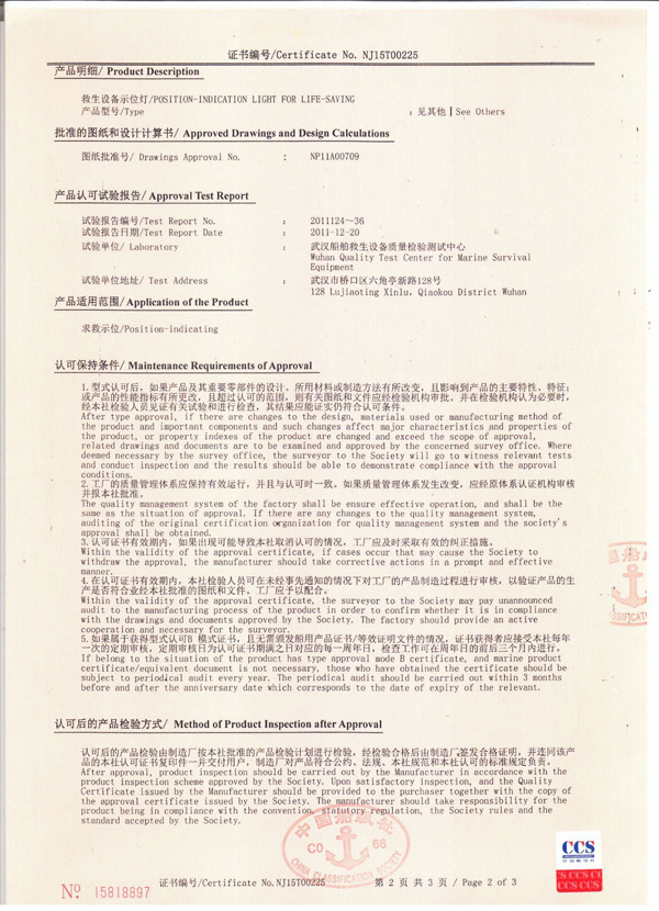 丹陽市救星船舶裝備有限公司為丹陽市船舶救生照明設(shè)備廠子公司,主要生產(chǎn)救生設(shè)備示位燈、雷達反射器、引航員軟梯、登乘梯等產(chǎn)品。其中救生設(shè)備示位燈采用國際上最先進的科學(xué)技術(shù)、生產(chǎn)工藝,優(yōu)質(zhì)材料制造,各項技術(shù)指標(biāo)超過國際先進水平,完全滿足國際最新標(biāo)準(zhǔn)。2012年元月取得“CCS”型式認(rèn)可證書,并具有歐共體“EC”證書。另外本公司制造的RDF400雷達反射器還獲得了實用新型專利。